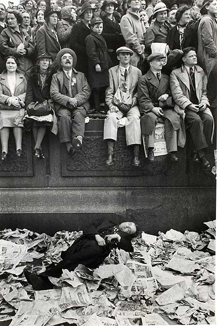 Pero lo que más me ha impresionado y a mi parecer de las más emocionantes en su percepción (y donde más tiempo se detenía la gente a observar) fue su faceta como reportero gráfico en diferentes revistas como Paris Match o la agencia Magnu. Sus reportajes estaban repletas de fotografías, eran las imágenes las que contaban la noticia. La mejor es, cuando le mandan a Londres para cubrir la coronación del rey Jorge VI en 1937. Cuando toda Francia y Europa esperaban las fotografías del gran evento histórico, Henri Cartier-Bresson decide innovar al elegir fotografiar a la multitud que estaban a lo largo del recorrido del nuevo rey y no al propio rey.