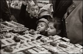 Brensson comenzó su carrera fotográfica como empiezan la mayoría de los aficionados de esta técnica, fotografiando rincones curiosos de la ciudad, atardeceres, contraluces, comportamientos urbanos de la sociedad, pero poco a poco vemos y vamos observando cómo nace el artista. Cartier-Bresson empieza a fotografiar escaparates, la atracción que tienen estos sobre los paseantes, el escaparate como una gran vitrina de lo novedoso, de lo último en el mercado industrial, automovilístico, aparatos electrodomésticos, la moda, etc. Pero a la vez no deja de explorar lo que la modernidad va dejando atrás y es cuando también nos ofrece imágenes de tiendas viejas, en absoluto abandono, con sus escaparates de maniquíes abandonados con algunas de sus extremidades amputadas, quien sabe si por el tiempo.