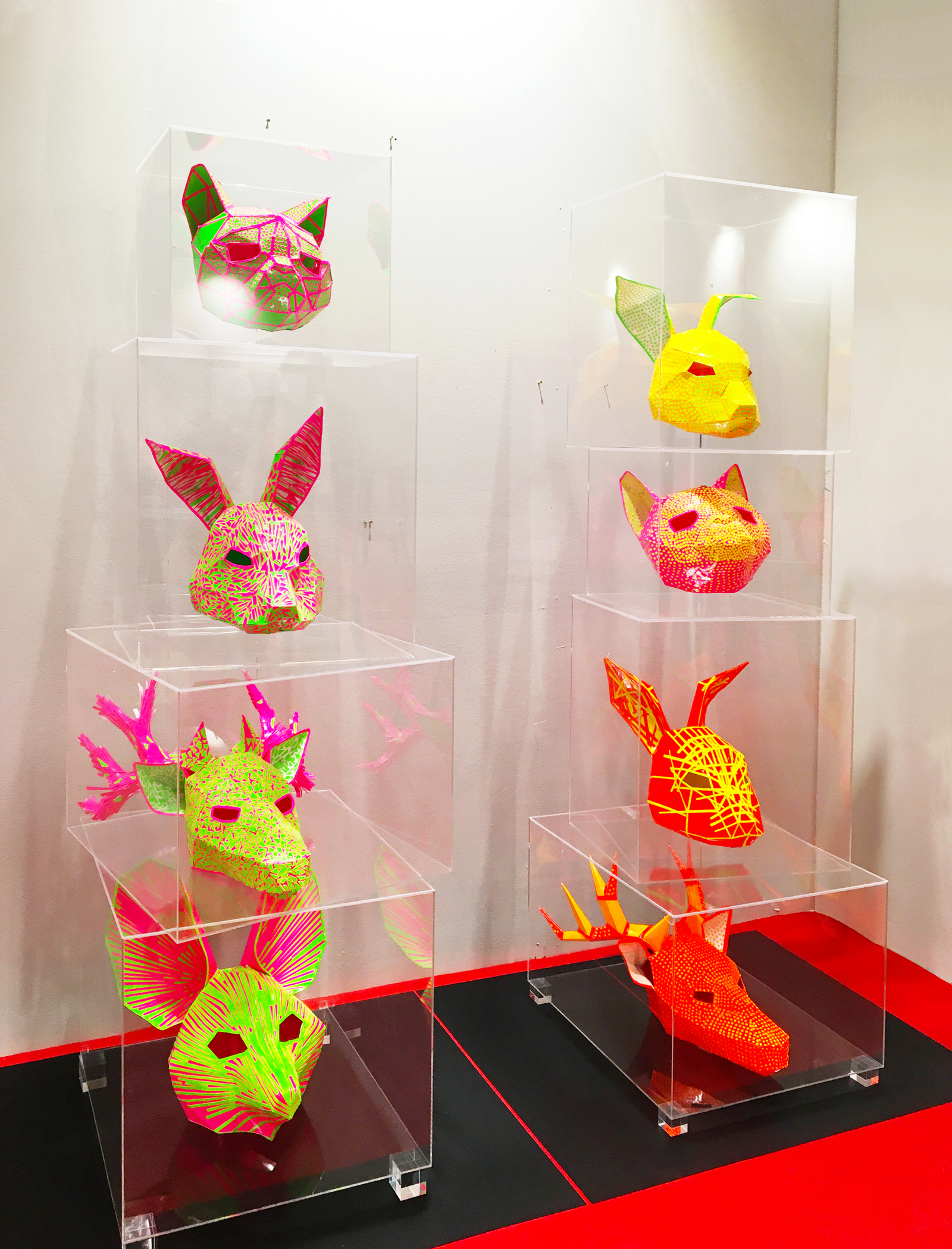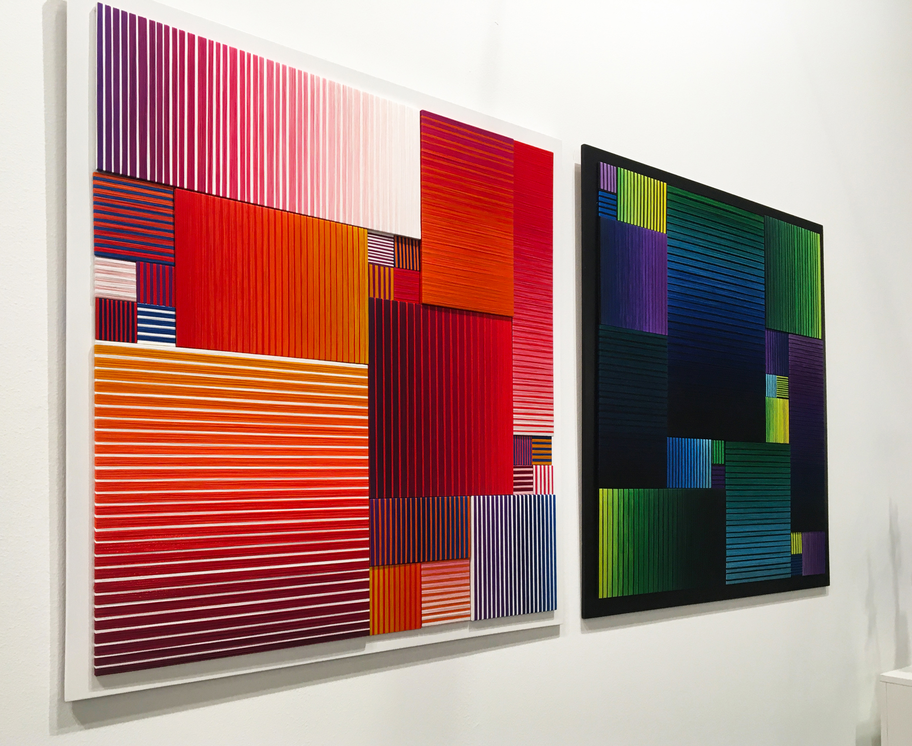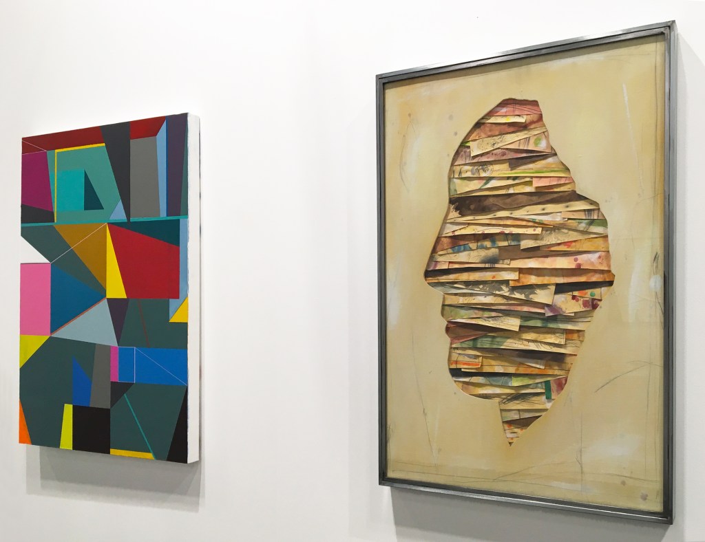Según vamos recorriendo la exposición, su obra nos desvela un trabajo de continua exploración y de posibilidades con la materia. «Su domino del dibujo encuentra en estos materiales una excelente herramienta expresiva de gran potencial estético; juega con las superposiciones para crear un cromatismos lleno de transparencias, un capeado de tiras de cintas adhesivas de papel que luego pinta fragmentando los colores como una composición constructivista que conforma un todo».