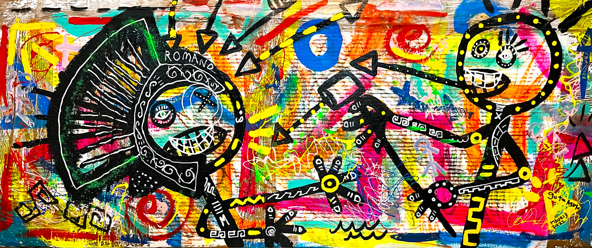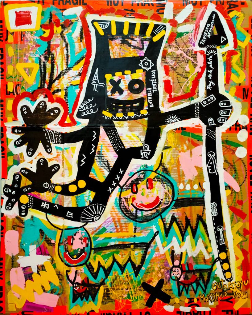 El arte de Guto Ajayu se identifica con sus raíces precolombinas, en su obra conviven de manera simultánea todos los componentes del Pop Art y el Urban Art con la estética precolombina.